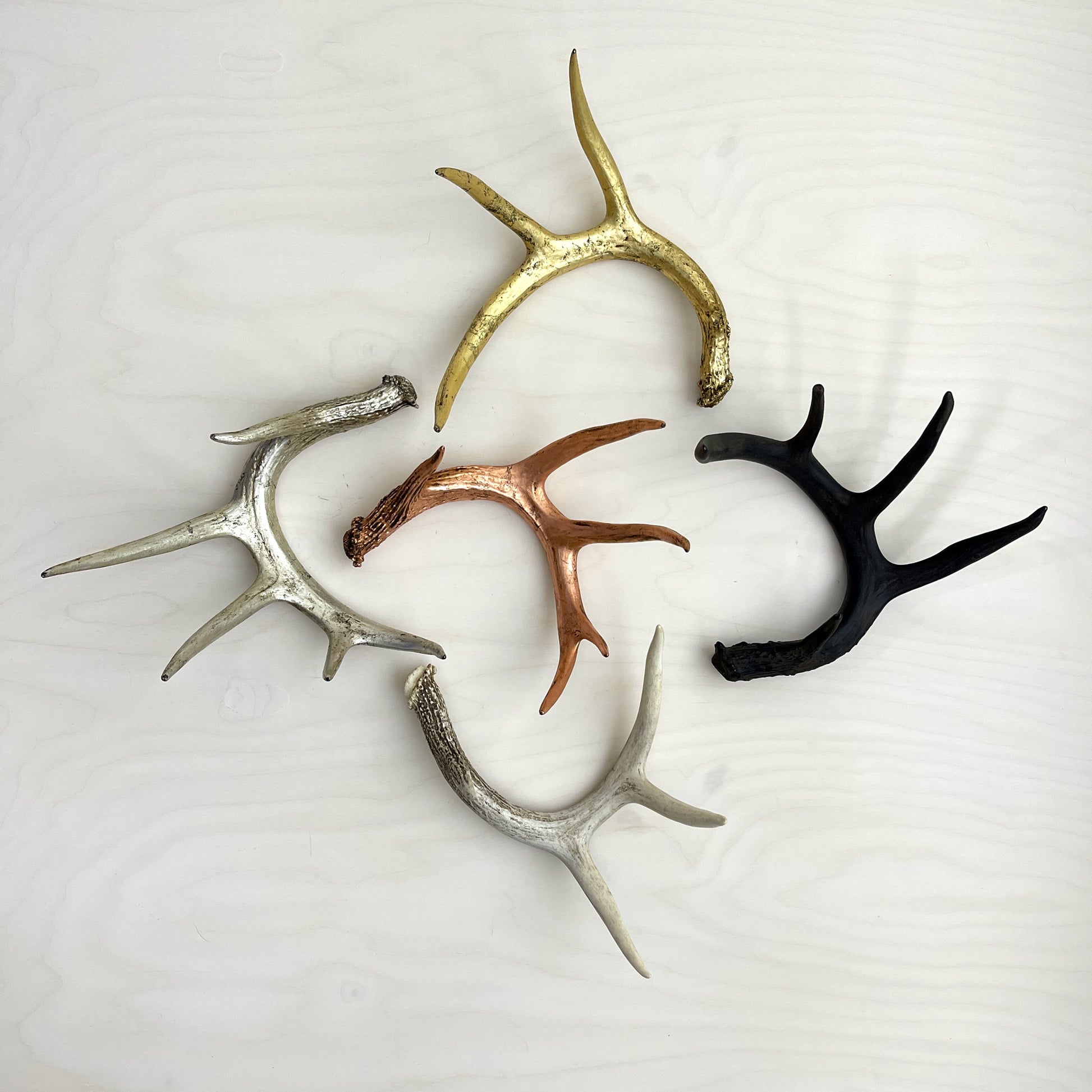 Natural deer antlers offer a timeless accent to any coffee table, book shelf or console. Available in natural, black, or gilded in copper, gold and silver.