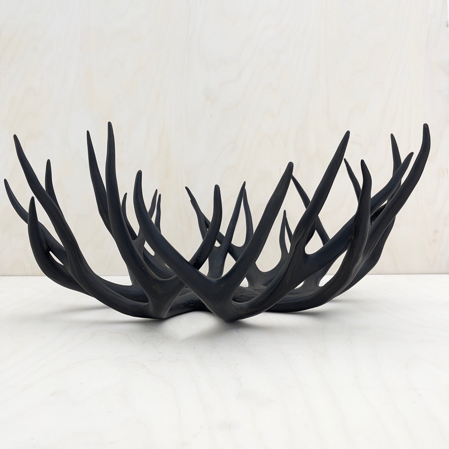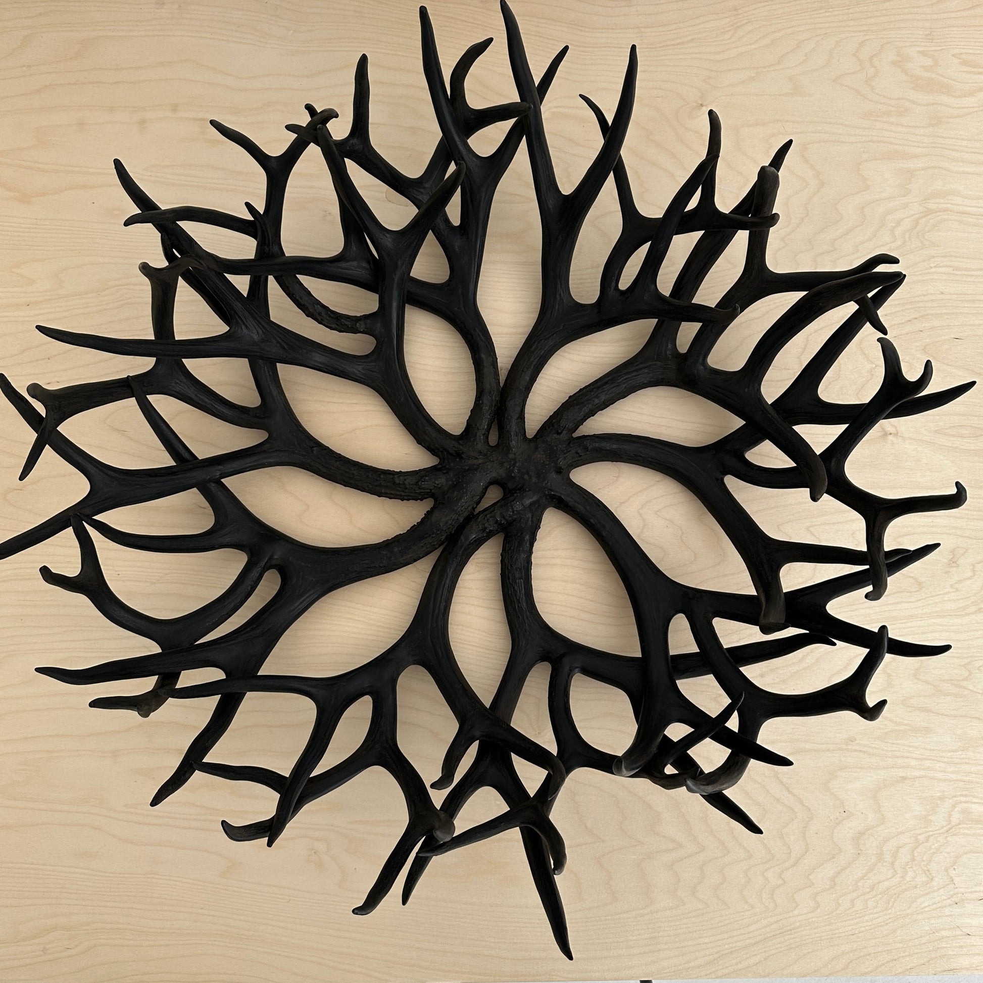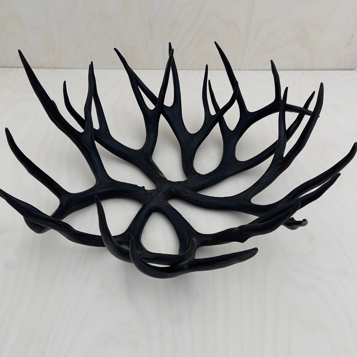 Numerous deer antlers are painstakingly cut and arranged to create a one-of-kind antler bowl. Perfect for the center of any mountain-modern table or hung on the wall as 3D art. Place a large bowl on the floor next to the sofa to hold your favorite throws.