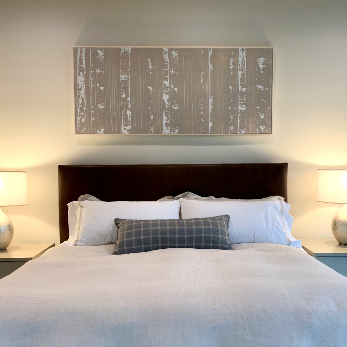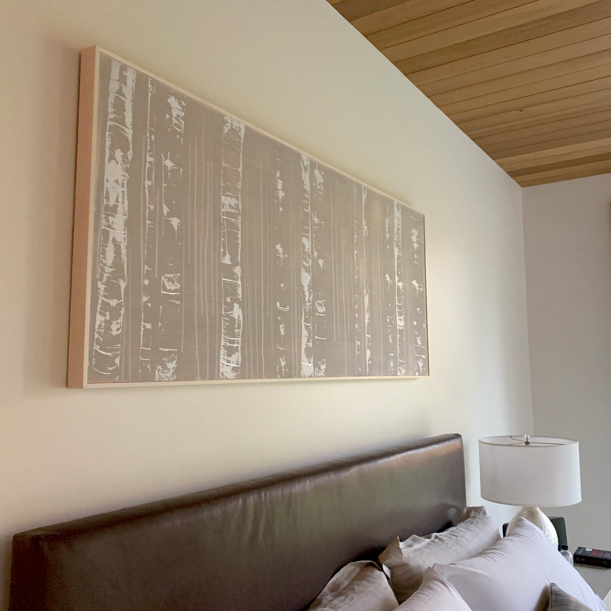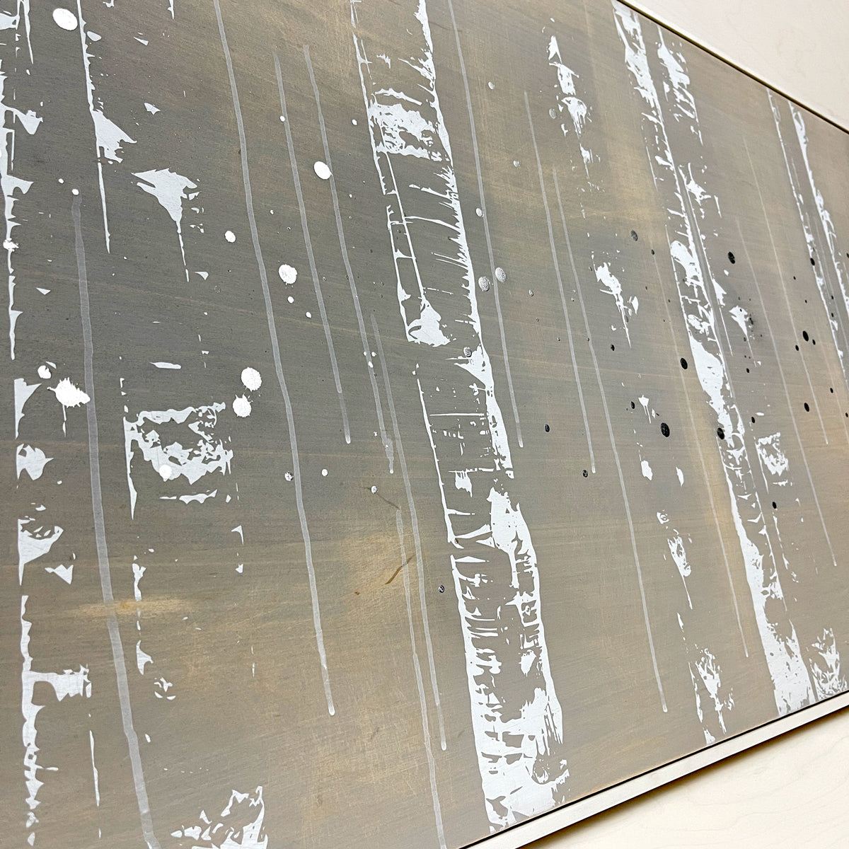 White aspens trunks are silk-screened onto a grey-washed wood panel. White and charcoal drip lines and paint drops finish this modern, mixed media painting.