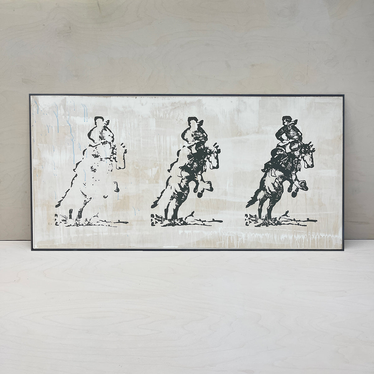 A cowboy on a bucking bronco comes into focus in this minimal piece. The three riders are silk-screened onto a white-washed wood panel. Blue and charcoal drips finish this modern, mixed media painting.