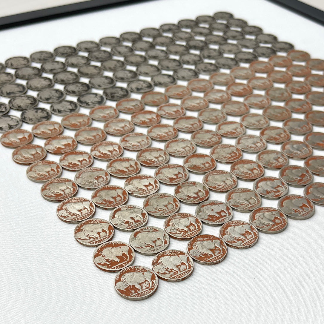 The Buffalo nickel (Indian Head nickel) was minted from 1913 - 1938. Artist and FH + Co. founder, Owen Mortensen, uses this coin as a design medium to create an original art piece, rooted in the ethos of the West. Each coin is colored with natural pigments to accentuate the bison/Indian head depicted.