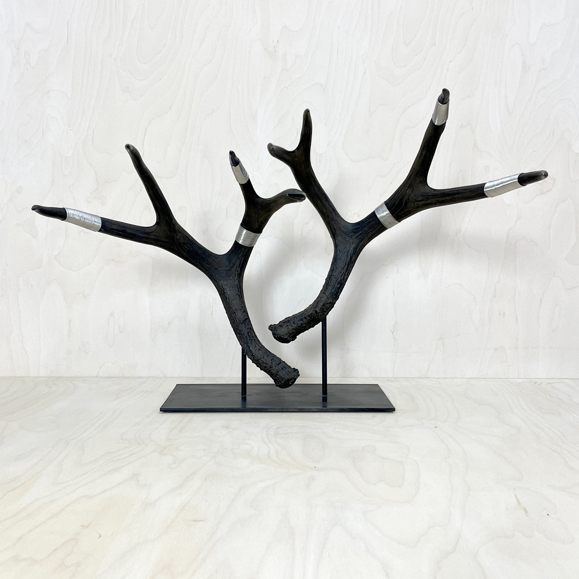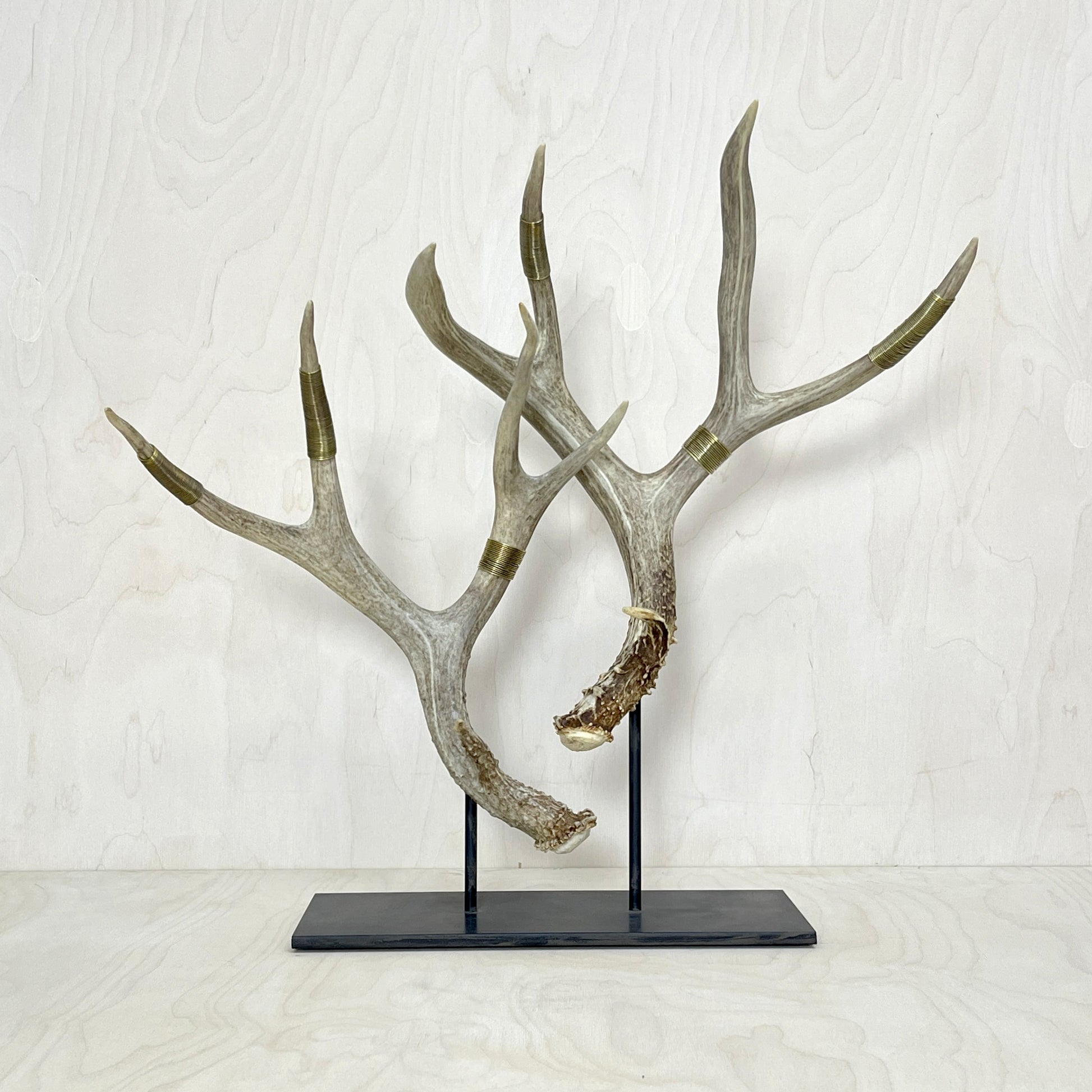 Add dimension, texture and interest to your mantel or shelf with our deer antler stands. Made of sun-bleached antlers, aesthetically wrapped in stainless, brass or black wire and set atop a metal stand. An ideal organic, yet modern accent for shelves, mantels and table tops.