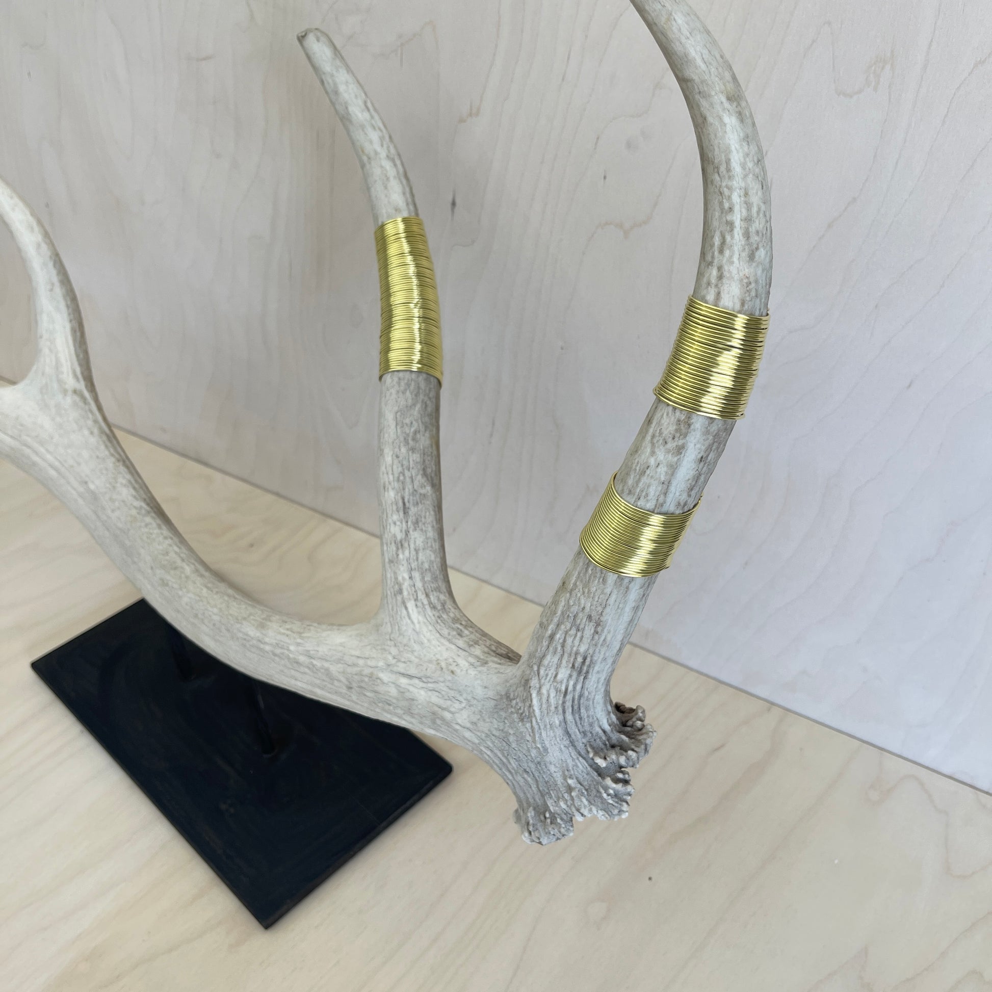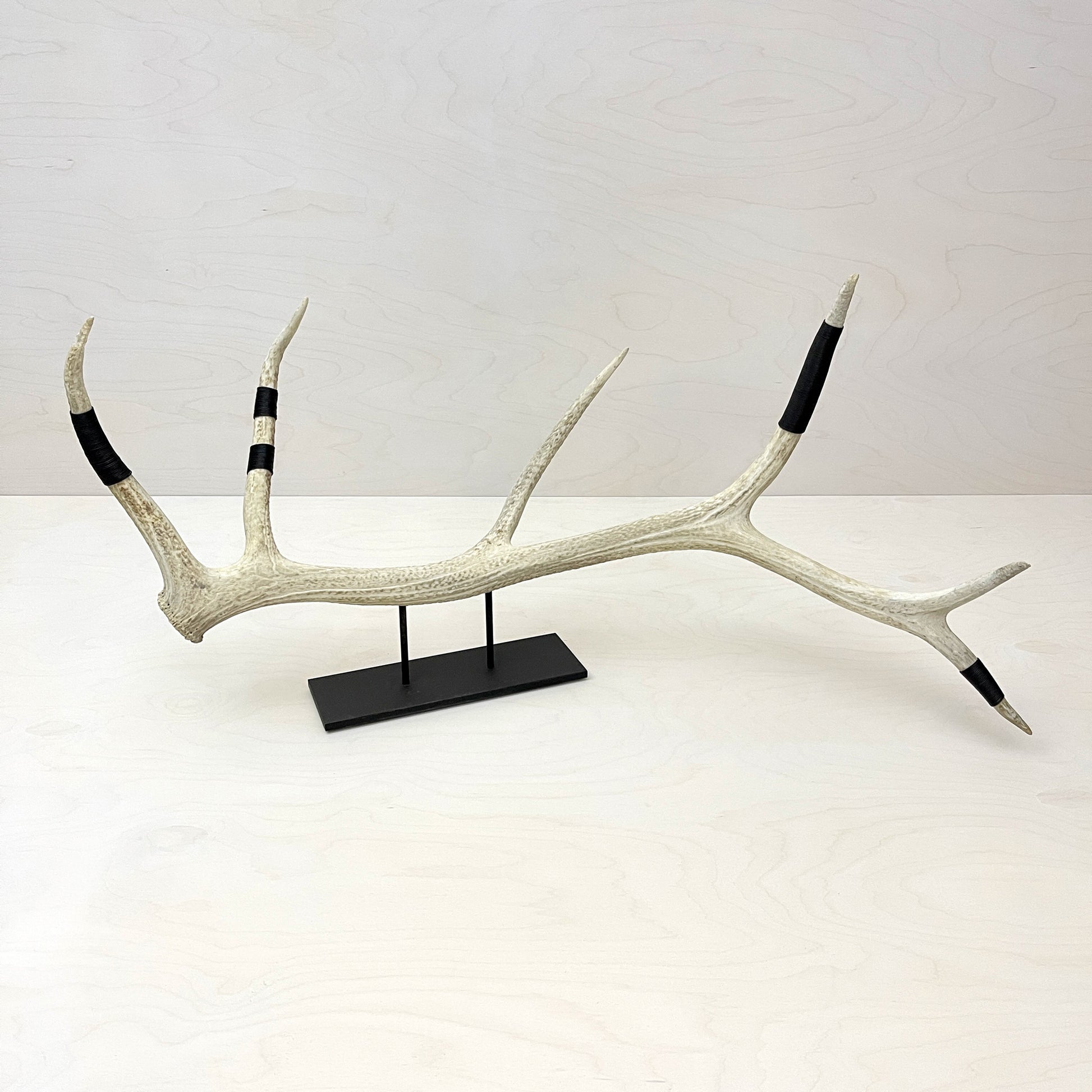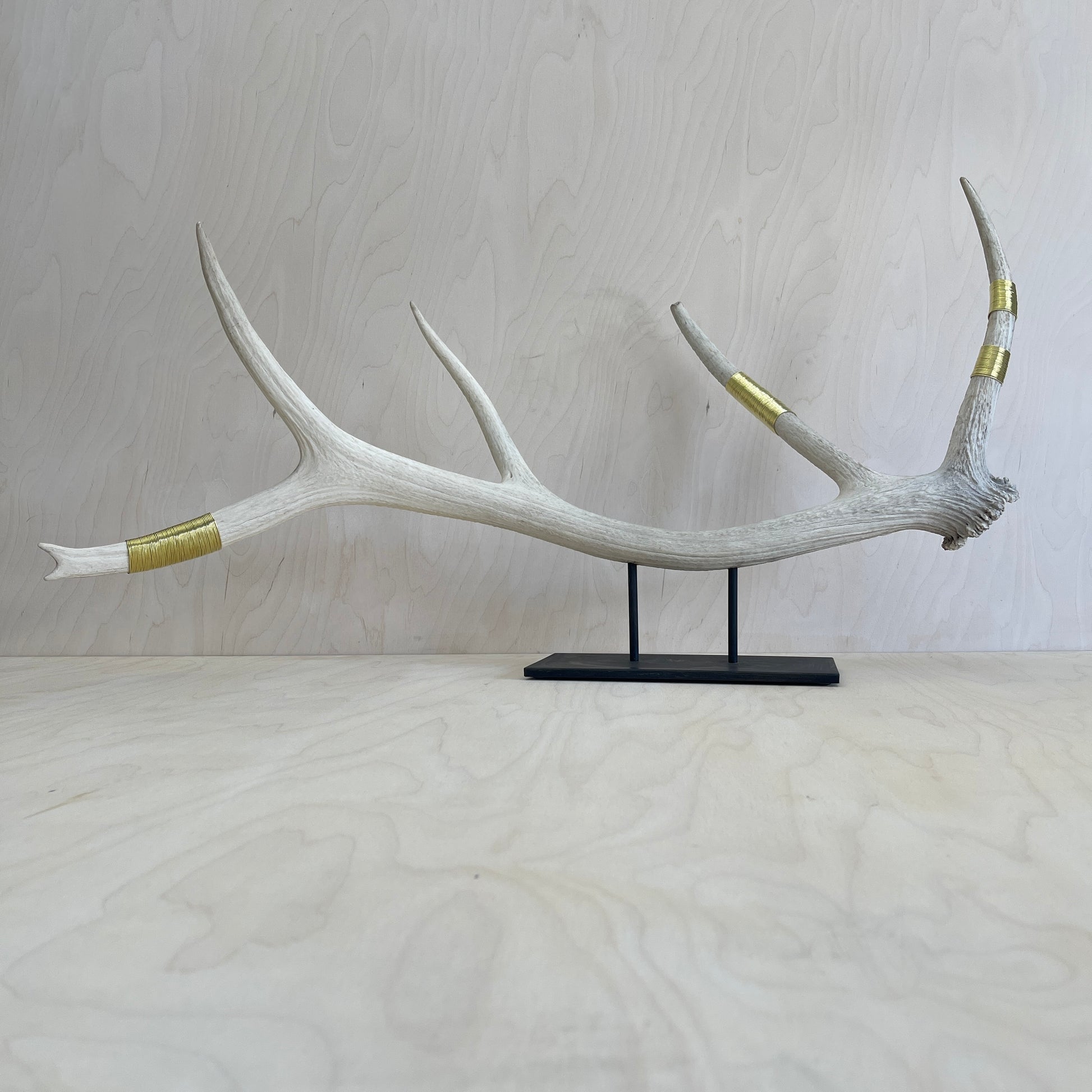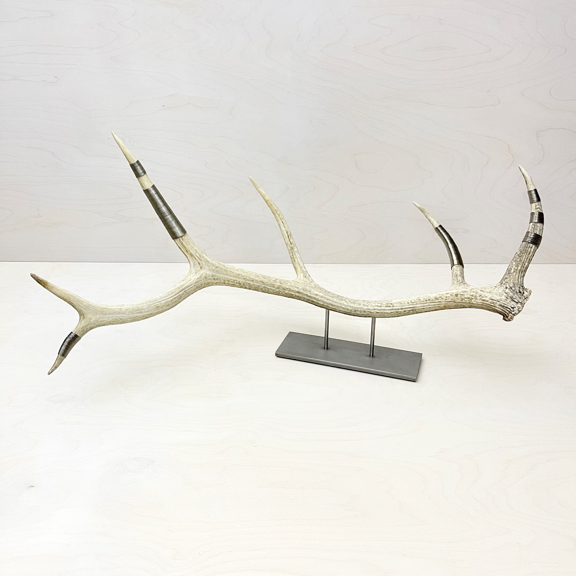A solitary elk antler gracefully sits atop a metal stand as a natural sculpture. Choose from numerous gilded finishes and wire-wrappings.