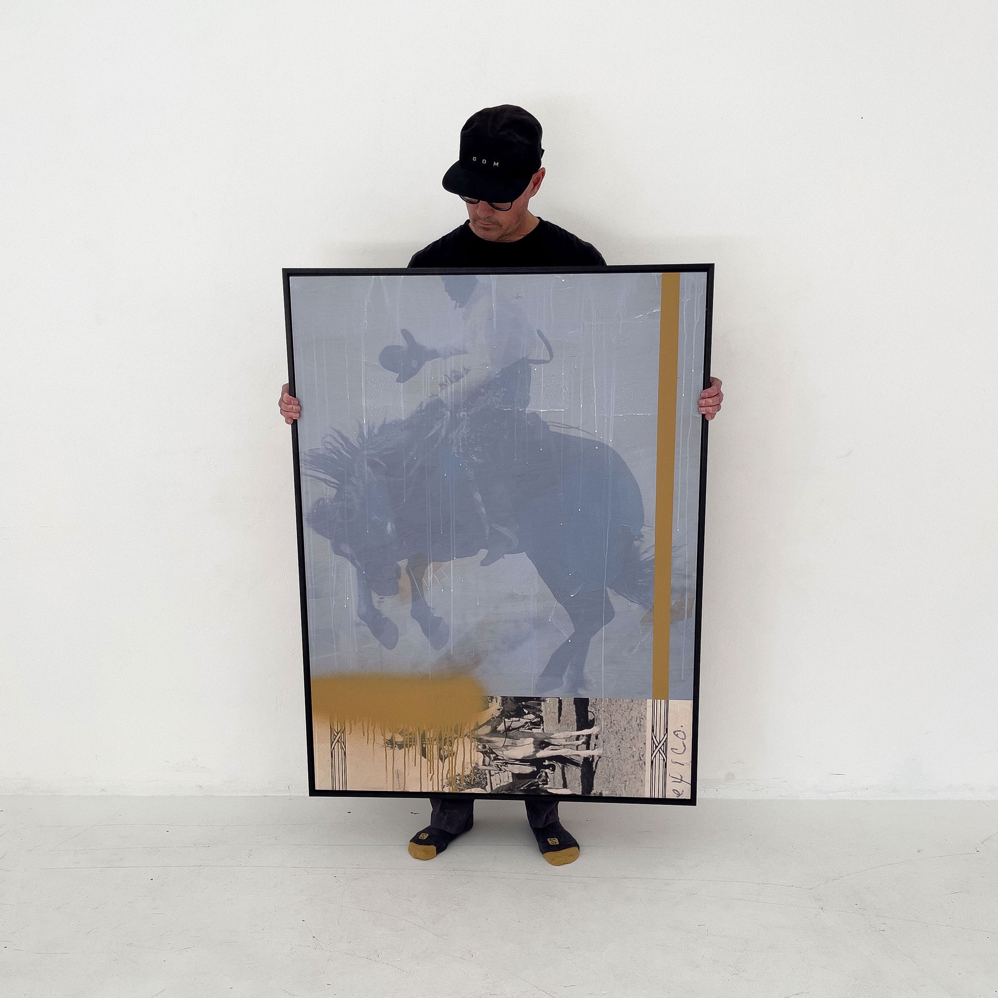 Ell Mortensen seamlessly mixes digital with analog in her unique mixed-media works. Vintage photos are digitally collaged, printed on a white-washed wood panel, then thoughtfully and precisely painted with acrylic and spray paints.