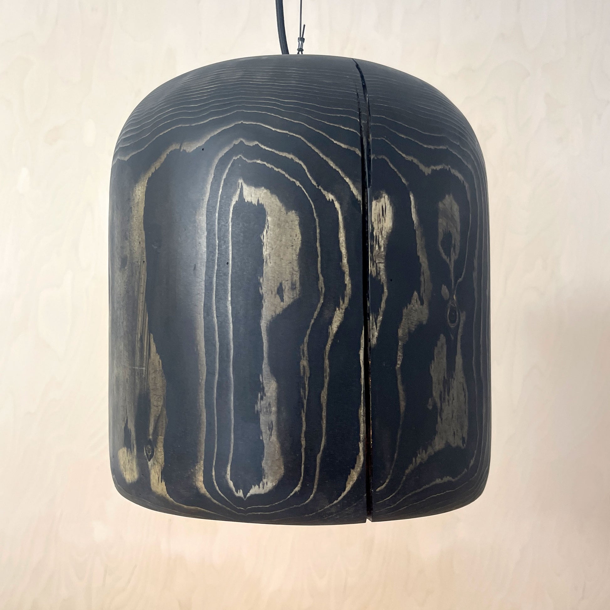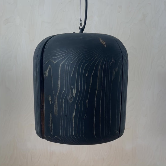 The Timber pendant is hand-hewn and sculpted from a solid fir log which offers unique, natural cracking in the wood, allowing light to organically leak from various angles.